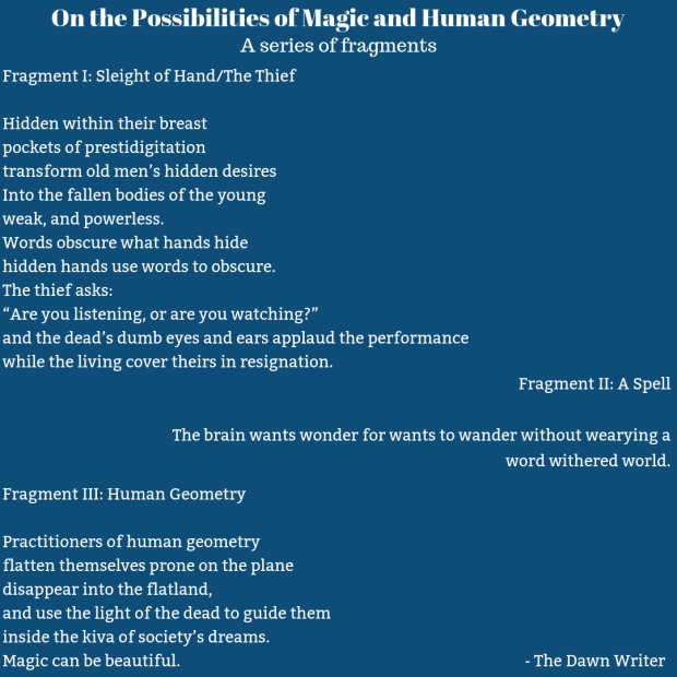 These fragments are the remnants of a difficult week filled with misunderstanding, sadness, death, pain and grief. In a search for beauty, truth, and goodness I turned inward and found glimmers of possibility. They are in their order anger, flight, and discovery. One day they may all cohere into something more grand, but for now they live apart, much like my mind and my heart right now. Cheers.